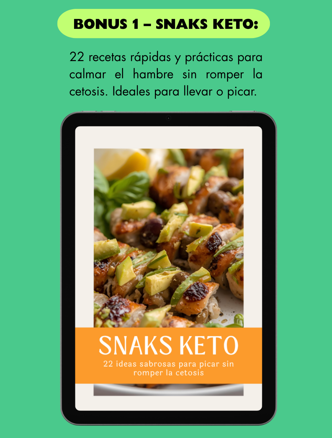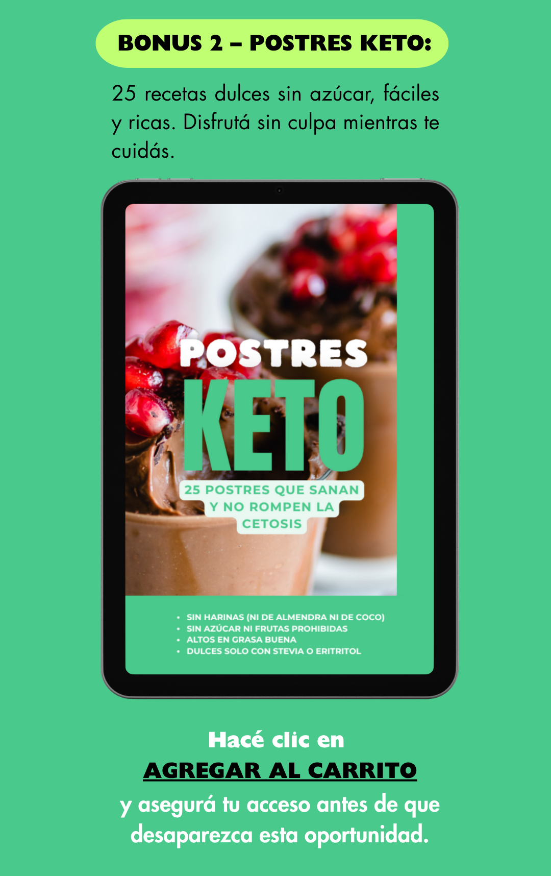 Incluye 10 recetas keto sin azúcar ni harina, explicadas paso a paso, con ingredientes simples y fotos tentadoras.